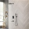 Душевой комплект BERGES NARDIS 3S BLACK - встраиваемый душевой комплект обладает трёхрежимной системой и состоит из верхней лейки - «тропического ливня», ручного душа, поворотного излива и смесителя. Лейка верхнего душа имеет инновационную систему самоочистки в виде гибких силиконовых вставок на форсунках душа, которые защищают изделие от известковых отложений. Изготовлены оба душа из ABS пластика. Комплект имеет матовое черное покрытие, которое выглядит безупречно на протяжении всего периода эксплуатации. Шланг выполнен из нержавеющей стали (внутри epdm), смеситель с латунным корпусом имеет керамический картридж с пропускной способностью 28 л/мин, все держатели и кронштейны сделаны из латуни и нержавеющей стали. Скрытый монтаж комплекта позволяет создавать красивое и эргономичное внутреннее пространство всего помещения.