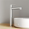 Стильный высокий смеситель для настольного умывальника удачно сочетает актуальный современный дизайн и классический цвет хрома. Тонкая удлиненная ручка добавляет смесителю изящества и комфорт в управлении. Расстояние между ручкой и изливом увеличено для большего удобства.