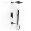 Душевой комплект BERGES NARDIS 3S BLACK - встраиваемый душевой комплект обладает трёхрежимной системой и состоит из верхней лейки - «тропического ливня», ручного душа, поворотного излива и смесителя. Лейка верхнего душа имеет инновационную систему самоочистки в виде гибких силиконовых вставок на форсунках душа, которые защищают изделие от известковых отложений. Изготовлены оба душа из ABS пластика. Комплект имеет матовое черное покрытие, которое выглядит безупречно на протяжении всего периода эксплуатации. Шланг выполнен из нержавеющей стали (внутри epdm), смеситель с латунным корпусом имеет керамический картридж с пропускной способностью 28 л/мин, все держатели и кронштейны сделаны из латуни и нержавеющей стали. Скрытый монтаж комплекта позволяет создавать красивое и эргономичное внутреннее пространство всего помещения.