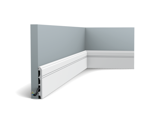 Современный плинтус с бороздками. Неброский дизайн для деликатного перехода от пола к стене.